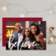 Inspiring Christmas greeting features believe in white brush script and one full photo with a festive jewel tone berry red back.