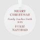 Brighten up your holiday décor with this modern, bilingual acrylic ornament! Displaying "Merry Christmas - Feliz Navidad" in stylish burgundy typography, this ornament can be customised with your family name for a unique touch. The sleek acrylic finish makes the cute bird and floral design stand out, adding a festive and personalised accent to your tree, wreath, or holiday display.