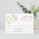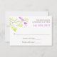This elegant and romantic wedding response card design features two violet purple birds in a delicate branch with lime green leaves. The wording is in brown with the reply date in purple that matches the birds on the branch.