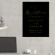 Elegant wedding welcome sign featuring "Welcome" in a modern gold foil calligraphy script with a black background (or colour of your choice). Personalise the black and gold foil wedding sign by adding your names, wedding date, and wedding location. The vertical welcome sign is designed to coordinate with our Modern Elegance wedding collection and is available in other colours.