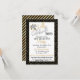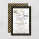 Elegant and fun New Years Eve Party invitation has a border of black with gold foil stars. There are fireworks at the top and it says Let's Celebrate in Gold and Silver foil. Typography then alternates between black and gold coloured fonts. Reverse side is diagonal stripes of black and gold foil.