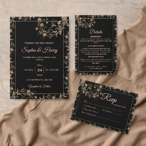 This black and tea pink floral wedding invitation with gold accents blends soft romantic tones with elegant dark contrast. The tea pink flowers and subtle gold details add a warm, luxurious touch, making it perfect for evening celebrations, garden weddings, or any romantic floral theme.