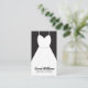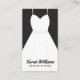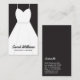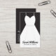 An elegant black and white business card for wedding and event planners, showing a white wedding dress. The simple and minimal vertical design features your name and business on the front. The back is kept plain black and includes all your contact details. This design is ideal for wedding planners and event planners. It will also do great for bridal boutiques or wedding dress rental services.