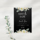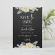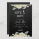Celebrate your love in style with this elegant black and white floral Save the Date wedding invitation. Featuring a sleek black background adorned with soft white and cream roses, lush greenery, and modern typography, this design radiates sophistication and timeless romance.