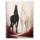 This artistic notebook features a striking illustration of a black and a white horse standing side by side, symbolizing balance and duality. Rendered in a sleek, minimalist style with smooth vector lines, the scene is set against a softly textured backdrop of neutral and red-toned abstract hills, creating a harmonious blend of contrast and calm. Perfect for lovers of modern equine art.