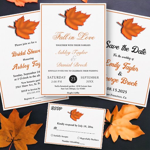 This elegant fall wedding invitation is perfect for a modern autumn wedding. The simple design features orange fall leaves with elegant white and orange typography on a black background