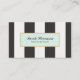 Bold black and white stripe pattern gives a modern, stylish touch. This chic, professional business card is ideal for beauty salons, spas, cosmetologists, estheticians, boutiques, jewelry designers, hair and fashion stylists or any other image aware professionals. An easy to customize template with matching gift cards and certificates.