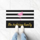 Let your visitors know they've reached the right home. You can add your family's name in faux gold script on the wide black stripe at the bottom. The background is black and white stripes. A pink flamingo is above the text.