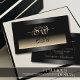 Make a lasting impression with this elegant and modern business card design featuring a black and beige colour gradient with a shimmery dark decor frame. Matching outstanding initials with mirror shadow effect and your signature.