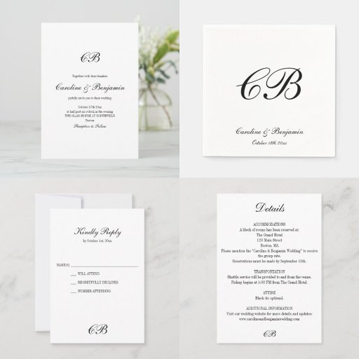 A timeless black and white wedding invitation with elegant monogram and formal serif script. The crisp black border adds classic structure, perfect for black-tie or formal weddings. Personalize with your details for a sophisticated first impression.