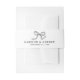 Elegant wedding invitation belly band featuring a delicate hand-drawn black bow at the top on a white background. The couple’s names and wedding date are displayed below in classic black serif lettering, creating a timeless and refined look. Perfect for modern, romantic, or black-tie weddings, this minimalist belly band adds a sophisticated finishing touch to your wedding stationery suite. Personalise with your details to beautifully tie your invitations together.