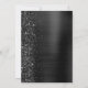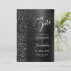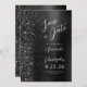 This elegant modern wedding save the date card features a black brushed metal background decorated with faux diamond glitter. The customisable text combines white script and sans serif fonts. The reverse side repeats the black brushed metal and glitter design.