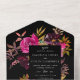 Elements: Vibrant floral arrangements surrounding a black frame. Elegant serif fonts with flourishes of script. Colours: black, burgundy, blush, pink, plum, cranberry, green, orange. Themes: elegant, boho, bothanical, bohemian, romantic, dark, moody, lush, garden, winter, fall, romantic. Collection: Elegant Black Burgundy Pink Floral Frame Wedding Collection. Product Type: All-In-One Wedding Invitations