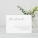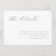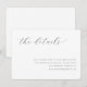 This wedding enclosure card features a minimalist design with ample white space, creating an elegant and clean appearance. The layout includes a prominent cursive script at the top centre that reads "the details," paired with smaller serif font text below for additional information. The monochromatic colour palette of black on white enhances clarity and sophistication, while the modern typography conveys a professional yet approachable tone. Ideal for weddings, this card provides a simple yet stylish way to direct guests to further details about the event.