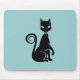 Elegant black cat posing with one paw raised. Has a cute curly tail and is wearing a fancy choker.