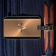 Travel in style with this Elegant Black Copper Monogram Name Mens Luggage Tag. This design is a modern masculine faux metallic copper, bronze, gold and black stripes background. It is personalised with name in bold black lettering and your initial in light beige on the centre.