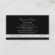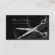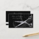 Elegant black and silver hair salon appointment reminder business cards with a pair of faux silver scissors entwined in a soft silhouette of beautiful curls. Personalise by entering the information of the professional hairstylist and hair salon. Flat printed image, NOT silver metallic.