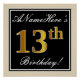 This simple and elegant birthday party poster design features a personalised message like "ANameHere’s 13th Birthday!" (with the "13th" having a faux/imitation gold-like colouring look) within a black-coloured square area featuring a simple border outline. The name is in an elegant white-coloured script-like text, and can be personalised. A personalised birthday party poster like this could perhaps be used as a decoration at a party being held for somebody who is celebrating their thirteenth birthday. [~Z0000236]