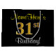 This simple, elegant birthday gift bag design features a personalised message like "NameHere’s 31st Birthday!" (with the "31st" having a faux/imitation gold-like colouring look) on a black coloured background. The name is in script-like, yellow-coloured text, and can be customised. A personalised birthday gift bag like this could perhaps be used when giving a present or gift to somebody who is celebrating their thirty first birthday. [~Z0000258]