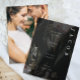 Modern black floral print photo wedding invitation features elegant typography and a beautiful dark muted botanical pattern on a black background. This chic moody floral invitation features a vintage floral background, and is perfect for a romantic wedding.