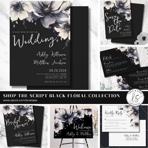 Cute Elegant Script Floral Black White WeddingDesigned by Jo P.