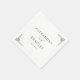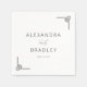 This wedding napkin features a minimalist and elegant design with a clean white background. The layout includes bold, uppercase serif typography for the names, complemented by a cursive script for "and," creating a sophisticated contrast. Decorative geometric elements in the corners add subtle visual interest without overwhelming the central text. The monochromatic colour palette of black on white emphasizes clarity and modernity, making it perfect for formal occasions that celebrate simplicity and grace.