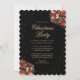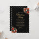 Elegant black and gold Christmas party invitation featuring floral arrangements and Christmas ornaments. Easily personalize this invitation with your party details.
