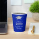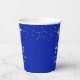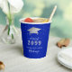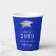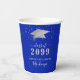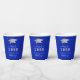 Elegant personalised royal blue and silver graduation party paper cups featuring a faux metallic silver foil graduation cap, silver confetti, fancy calligraphy script typography and class year with CONGRATULATIONS and your graduate's name against an editable royal blue background colour you can change to a school colour or coordinating party theme colour by clicking EDIT. ASSISTANCE:  For help with design modification or personalisation, colour change, transferring the design to another product or you would like coordinating items, contact the designer BEFORE ORDERING via Zazzle Chat or makeitaboutyoustore@gmail.com.