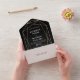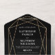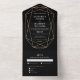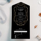 This lovely all-in-one wedding invitation design is simple yet elegant. This design features a chic black background with geometric gem in faux gold foil and elegant typography. The inside of the card features the invitation, wedding details, and an rsvp card that can be detached and mailed. Make sure to put postcard rate stamps on the reply cards.