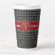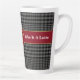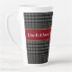 Express yourself in style with this customisable latte mug that features a classic grey and black glen plaid pattern, a red border, gold emblem, and customisable text that says, Like It a Latte. This design is elegant and masculine, and it will make a great gift for fathers, sons, friends, and coffee or tea lovers. Add your own logo for a unique corporate or marketing gift or keep the symbol as it is. Change the text on both sides of the mug to fit your needs.
