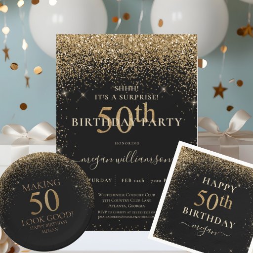 Elegant Black Gold Glitter 50th Birthday Party Invitation
