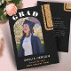 Elegant Black Gold Glitter Grad Photo Graduation Announcement. Modern design with faux gold glitter on a black background with graduate's name and a photo in an arch frame on the front. Customise the text and photo on the front and the announcement on the backside.