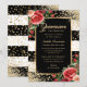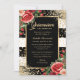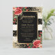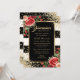 Beautiful black and gold floral quinceañera party invitation featuring red roses and gold confetti against a black and white striped background.
