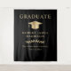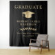 Elegant black graduation party welcome tapestry and photo booth backdrop featuring a gold grad cap, "Graduate" and the graduate's name, school and class year in classic gold typography.