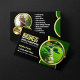 This elegant and professional business card design features a sophisticated black, green and gold colour scheme, a beautiful image of a lush, manicured garden, and a circular design element that adds a touch of sophistication. The back of the card includes a list of your services and a photo of a lawn care professional, further showcasing your expertise.