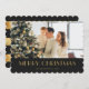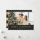 Modern black and gold foil photo Merry Christmas card featuring black and faux gold foil stripes with falling snow at the back and a photo on the front. Easily personalise this elegant holiday card with your photo and text.