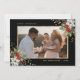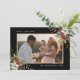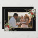 Elegant black and gold photo Christmas card featuring white poinsettia, holly and berries.