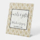 This design features an elegant gold vintage pattern. The black text is framed with a black border and opaque white background. The damask gold pattern sits elegantly in the background. The combination of the black and gold colours creates a sophisticated, trendy and chic style. Elegant wedding cards and gifts sign design with modern elements. The simple setup of the typography gives it a distinct style. Matching wedding invitations and other stationery items are also available.