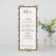 This design features an elegant gold vintage pattern. The black text is framed with a black border and opaque white background. The damask gold pattern sits elegantly in the background. The combination of the black and gold colours creates a sophisticated, trendy and chic style. Elegant wedding menu card design with modern elements. The simple setup of the typography gives it a distinct style. Matching wedding invitations and other stationery items are also available.