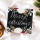 Beautiful watercolor floral Christmas greeting card features pretty white flowers with gold and green leafy greenery, elegant Merry Christmas script, and an elegant black background. Personalise with your name!