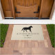 Elegant black horse silhouette in the centre. Tge background has a very small white scalloped pattern over taupe and personalised family name text. This doormat exudes refinement and would make a great impression on your house guests as they are welcomed to your home!