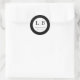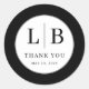 This elegant wedding sticker features a minimalist circular design with bold serif typography. The layout includes two large initials separated by a vertical line, followed by the phrase "THANK YOU" in smaller uppercase letters, creating a formal and sophisticated look. The black text on a white background emphasizes contrast and readability, making it perfect for expressing gratitude at your special event. Its clean composition and classic style make it an ideal choice for those seeking a timeless and refined aesthetic.
