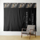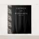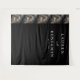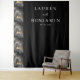 This elegant wedding backdrop features a sophisticated split design, with the left side showcasing a luxurious marbled pattern in shades of grey, black, and gold, reminiscent of natural stone. The right side offers a stark contrast with a deep matte black background, highlighting white serif typography that adds a formal touch. The clean layout emphasizes readability and modern aesthetics, making it perfect for creating a refined atmosphere at your special event. Its balanced composition and minimalistic approach ensure it complements any wedding theme while providing ample space for customisation.