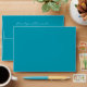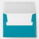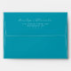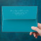 This wedding envelope features a minimalist and elegant design with a vibrant teal background. The layout is centered, showcasing the names in an elegant script font, followed by the address details in a clean serif typeface. The color palette of black text on a teal background creates a sophisticated contrast, enhancing readability and formality. Perfect for weddings or formal events, this design exudes clarity and modern sophistication, making it ideal for invitations or announcements.