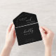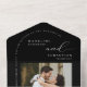 This all-in-one invitation features an elegant calligraphy and simple typography font with an arch shape heading on a black background and photo and QR Code. The simplicity of this design adds a touch of elegance to your wedding. It works well with many wedding themes and definitely a great addition to your wedding. Just customise the names and wording in a few easy steps and personalise the all-in-one invitation card with your photo of the happy couple and replace the QR Code with yours to give your invitation a nice personal touch. This invitation will save you money to send everything at once. It has a perforated RSVP postcard can be easy to tear off and your guest just sends it to you. Just simply fold each card into the outlined shape -- seal and send to your guests. No envelope is needed for shipping -- just postage.