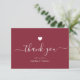 This modern chic burgundy red heart wedding thank you note features hand-lettered script calligraphy alongside your names in elegant serif typography. Space for additional message on the back.