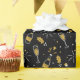 Beautifully designed wrapping paper featuring a festive pattern of sparking wine bottles, glasses, fireworks, holly and berries against a black background.