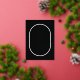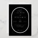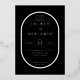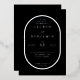 This elegant wedding invitation features a minimalist design with a black background and crisp white text, creating a sophisticated contrast. The layout is centred around an oval border that frames the essential details, using clean serif typography for a formal touch. Perfect for couples seeking a classic and timeless look, this invitation conveys formality and simplicity, ideal for a memorable celebration. Customisable elements allow personalisation while maintaining its chic aesthetic, making it suitable for any special occasion.