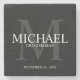 This coaster features personalised groomsman's name with title and wedding date in white and monogram in grey as background, in classic serif font style, on black background.