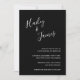 Modern wedding invitation featuring a simple design with your names in an elegant handwritten script at the top left and your event details in right alignment at the bottom right. The backside has your favourite photo. All design elements are in white over a black background and may be changed in the design editing tool. The chic hand lettering adds a romantic touch to this minimalist design.